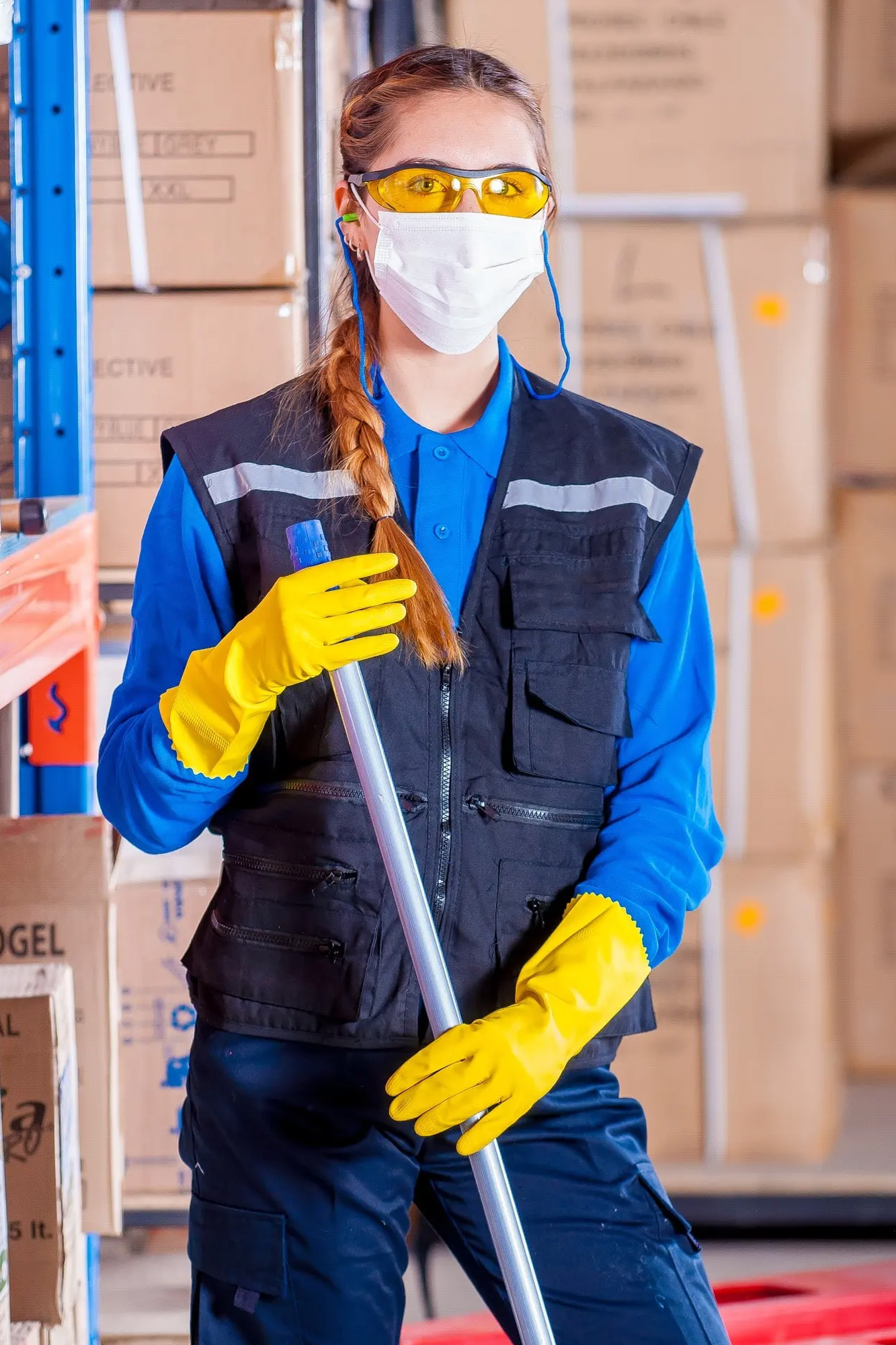 Inclui luvas de látex, máscaras respiratórias, óculos de proteção e calçados antiderrapantes para proteger os zeladores contra produtos químicos, poeira e riscos de escorregamento.